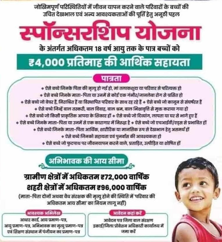 *स्पॉन्सरशिप से 18 वर्ष से कम उम्र के बच्चों को मिलेंगे प्रतिमाह 4 हजार रुपए*